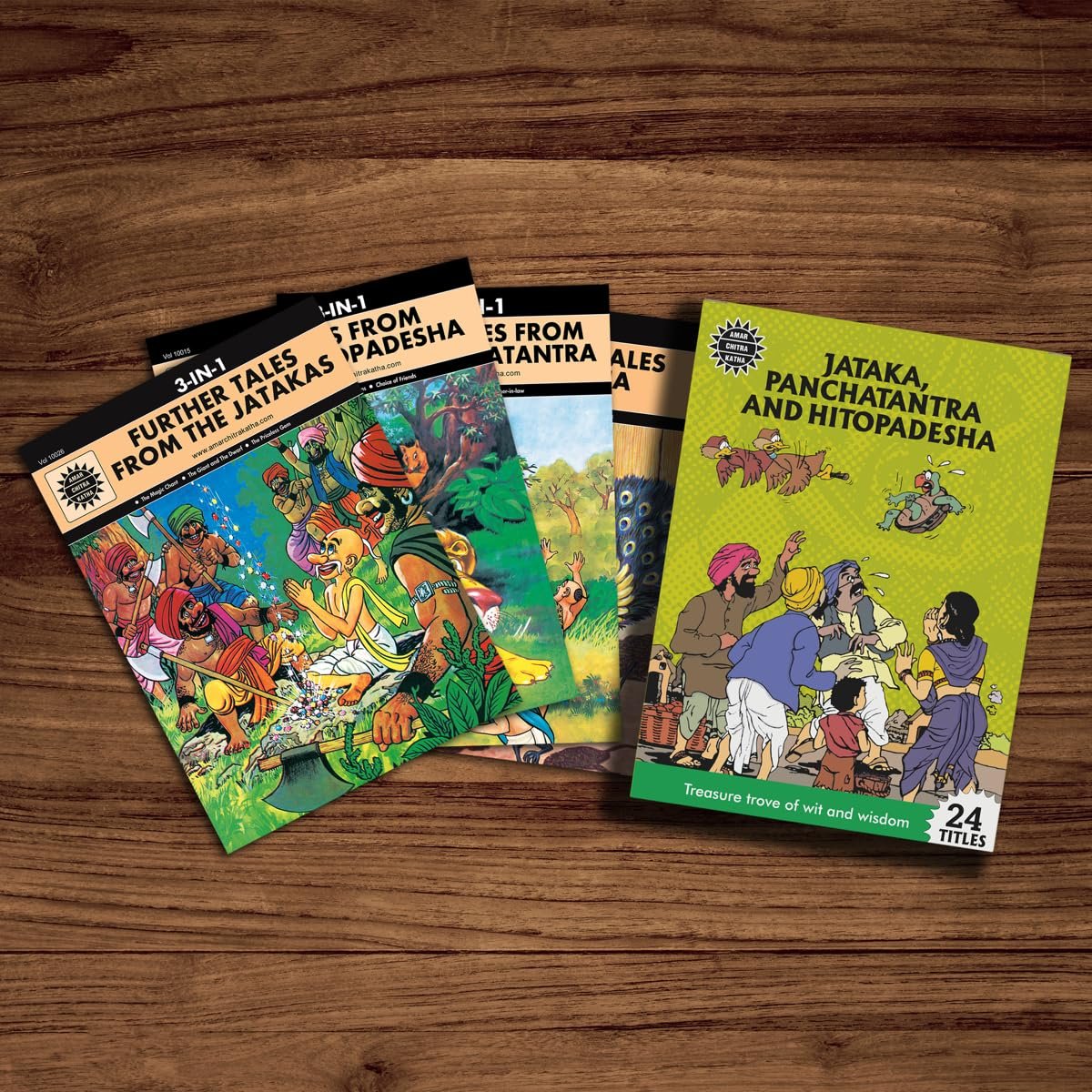 This pack consists of following titles – The Jackal and the Wardrum, Jataka Tales: The Mouse Merchant, Monkey Stories, Panchatantra : The Greedy MotherβInβLaw, Jackal Stories, Panchatantra : The Dullard and Other Stories, Elephant Stories, Jataka Tales: Stories of Wisdom, Deer Stories, Jataka Tales: True Friends, Choice of Friends, Jataka Tales: Stories of Courage, How the Jackal Ate the Elephant, Jataka Tales: Tales of Misers, Crows and Owls, Jataka Tales: The Hidden Treasure, The Brahmin and the Goat, Jataka Tales: Nandi Vishala, Jataka Tales: Bird Stories, Hitopadesha: How Friends are Parted, Jataka Tales: The Magic Chant, The Deadly Feast, Jataka Tales: The Giant and the Dwarf.
